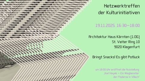 Nach einigen anregenden und informativen Netzwerktreffen hostet diesmal das jüngste Mitglied der IG KiKK das Netzwerktreffen der Kulturinitiativen. Das Architektur Haus Kärnten. Danke dafür! 5. Netzwerktreffen der Kulturinitiativen 19.11.2025, 16:30-18:00 Architektur Haus Kärnten (1.OG) St. Veiter Ring 10 9020 Klagenfurt